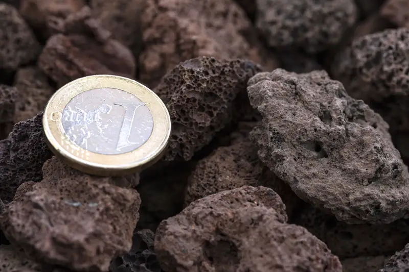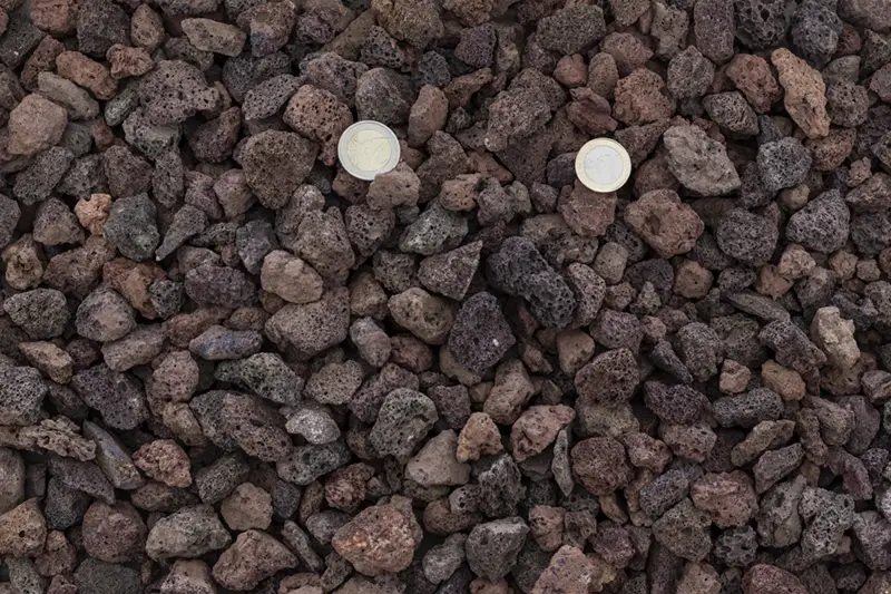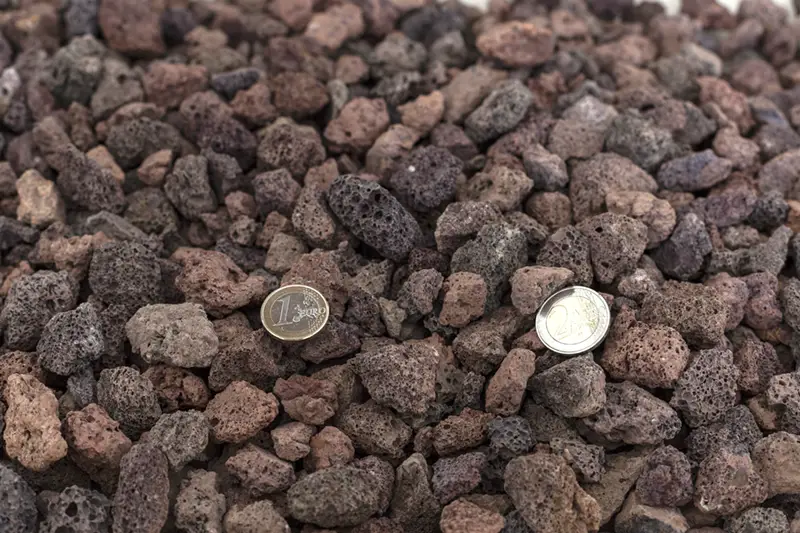 La china volcánica es un material muy poroso y ligero, por lo que tiene la capacidad de retener una gran cantidad de humedad de la tierra. Tiene un color rojo vivo