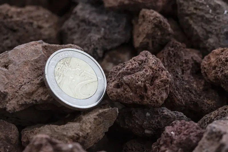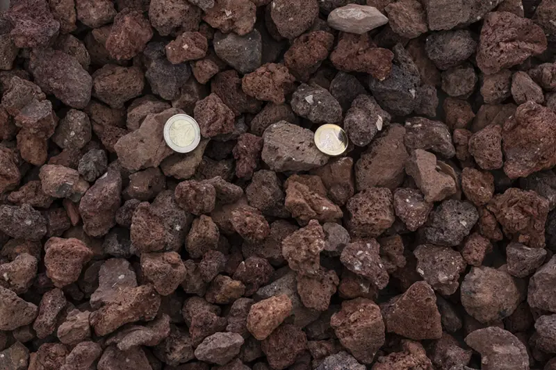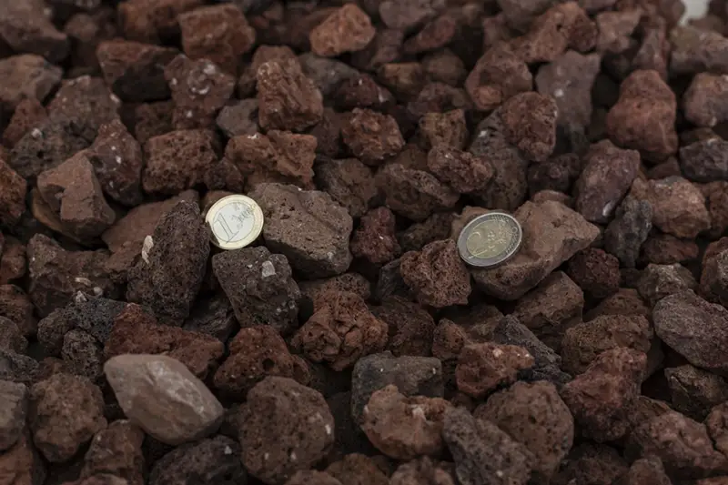 La china volcánica es un material muy poroso y ligero, por lo que tiene la capacidad de retener una gran cantidad de humedad de la tierra. Tiene un color rojo vivo