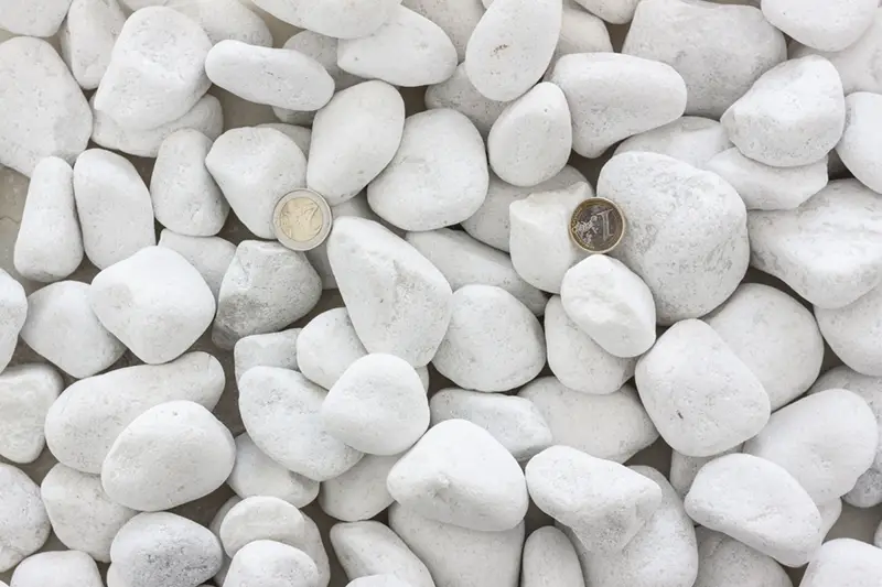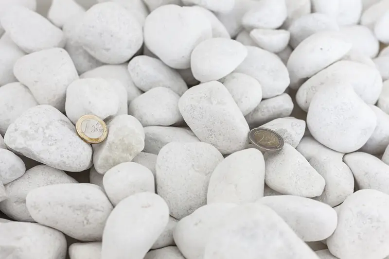 El canto rodado blanco es una piedra blanca para decoración de jardín. Su aspecto es más blanquecino que otros cantos y eso le confiere una gran imagen y un aspecto limpio. Al tener una forma redondeada sin aristas se puede caminar sobre él, incluso aunque sea con los pies descalzos. Es una solución que da un aspecto lujoso al jardín con un precio contenido. Para favorecer su durabilidad y, sobre todo, mantener su color blanco, es recomendable para lugares soleados y donde no exista demasiada humedad. No obstante, si la superficie es muy grande y la zona muy soleada, puede provocar deslumbramiento y sensación incómoda.